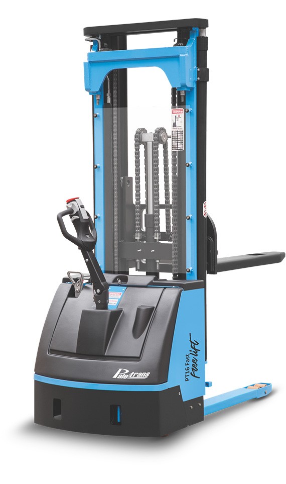 El montacargas eléctrico deslizante PT1645 Fast, tiene una velocidad de elevación 30% más alta que la línea tradicional de PT. En esta línea, existe la posibilidad de instalar una plataforma opcional para un operador de pie, a bordo. Desliza y funciona exclusivamente en paletas abiertas y es ideal para almacenes y carga y descarga de camiones y furgonetas.
